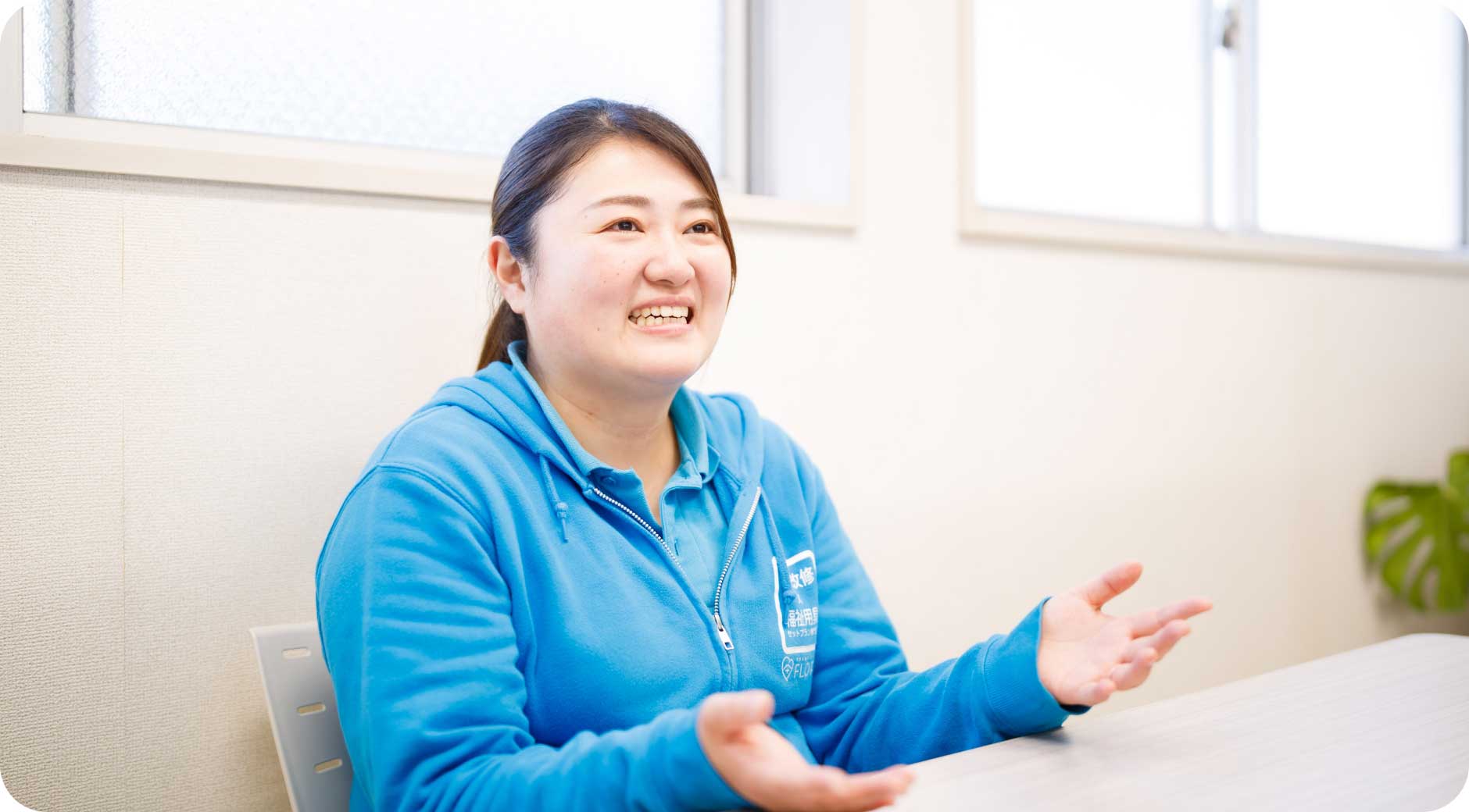 施設で働いていたときは、スタッフの人数が多いということからもコミュニケーションがなかなか難しくて、個々それぞれで動くことが多かったと思います。フローラという会社はスタッフの人数もまだまだ少ないので、自分がわからないときにすぐに聞ける先輩たちが周りにいます。みんなが自分のことを気にかけてくれているのを感じていて、チームワークでみんなで一緒に働いている感がとても魅力です。あと、鬼束さん(社長)の人柄も、ぜんぜん社長っぽい威張った感じがなく、なんでも話を聞いてくれたりアドバイスをしてくれたりするのもとても働きやすいなと感じながらお仕事をしています。